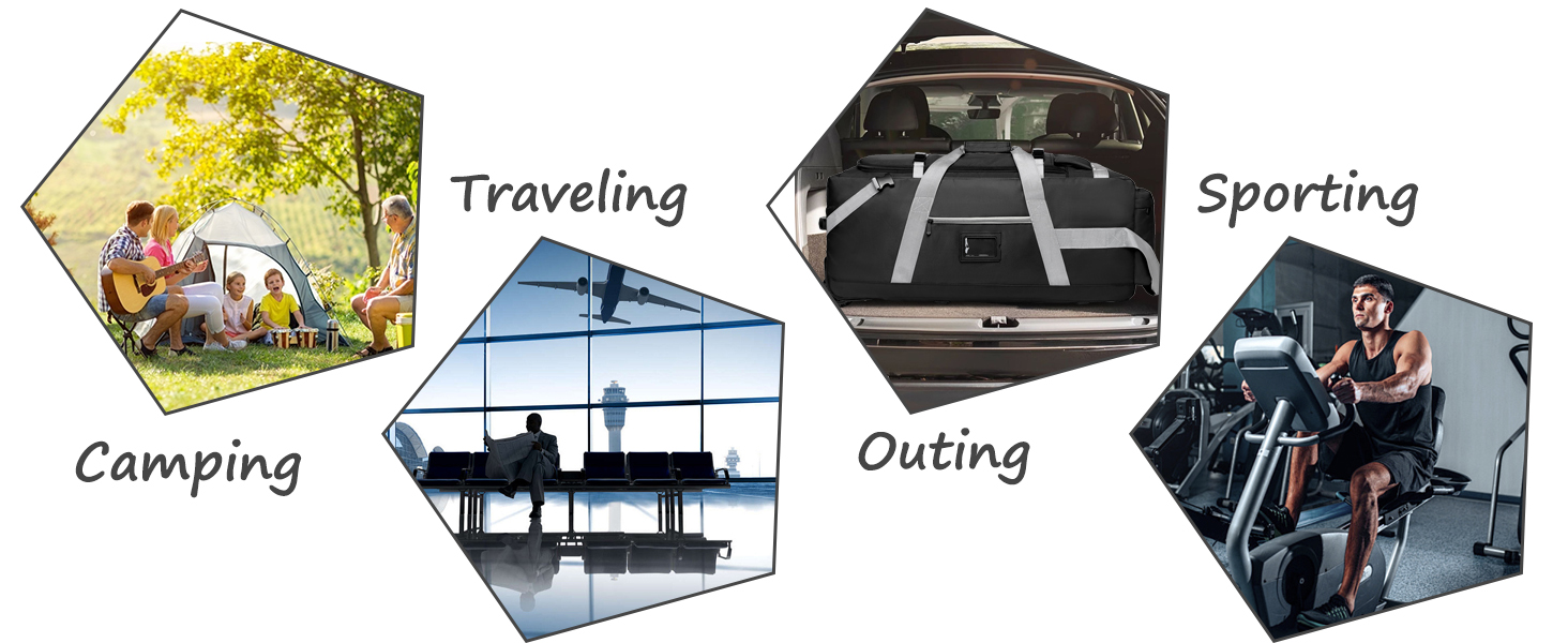 Easy To Carry: 3 different ways to carry it to make your trip more convenient.This foldable travel duffle bag is equipped with sturdy wheels to reduce the stress of carrying heavy items. The big camping duffle bag also comes with hidden padded backpack straps, The padded shoulder straps ensure maximum comfort, even during long journeys. And the 3 different positions of the handles allow you to use the large duffel bag for travel with one or two hands, or with others