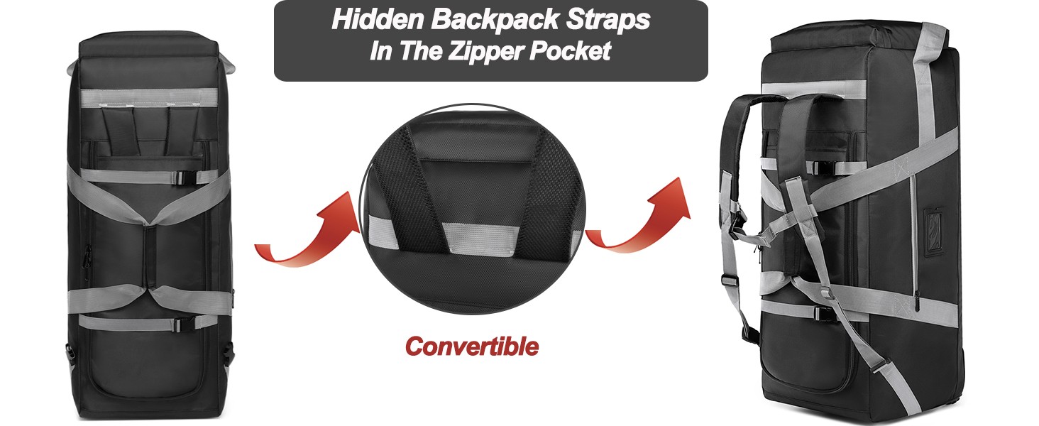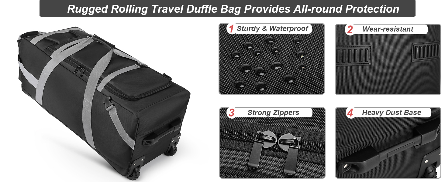 Professional Protection: The travel duffel bag is made of thicken sturdy Oxford cloth, very wear-resistant, waterproof and odorless. Tight stitching and strong zippers all enhance the lifespan of this roller large duffel bacakpack, so you can use it with confidence. The waterproof material allows you to also use the duffle bag with wheels when traveling or camping outdoors to keep your items dry