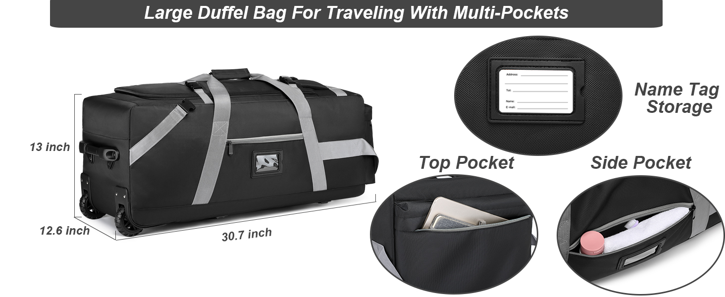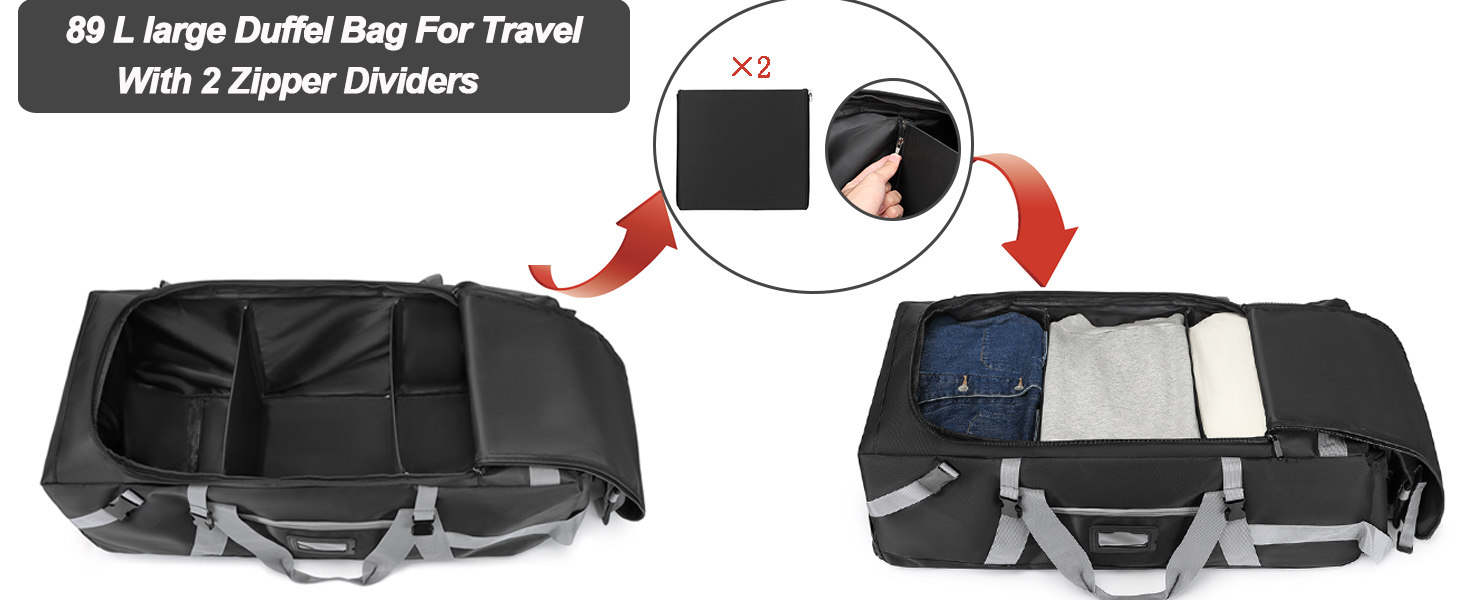 Large Rolling Duffle Bag: This soft travel duffel bag has a capacity of up to 89L, with a size of 30.7”*12.6”*13", plenty of space to hold your sports equipment and travel essentials. The opening of this roller duffel bag is large enough to fit bedspreads, sheets, towels, coffee pots and other supplies, and for your convenience, we also equipped with 2 zippered dividers, you can organize your luggage well in the duffel bag with wheels