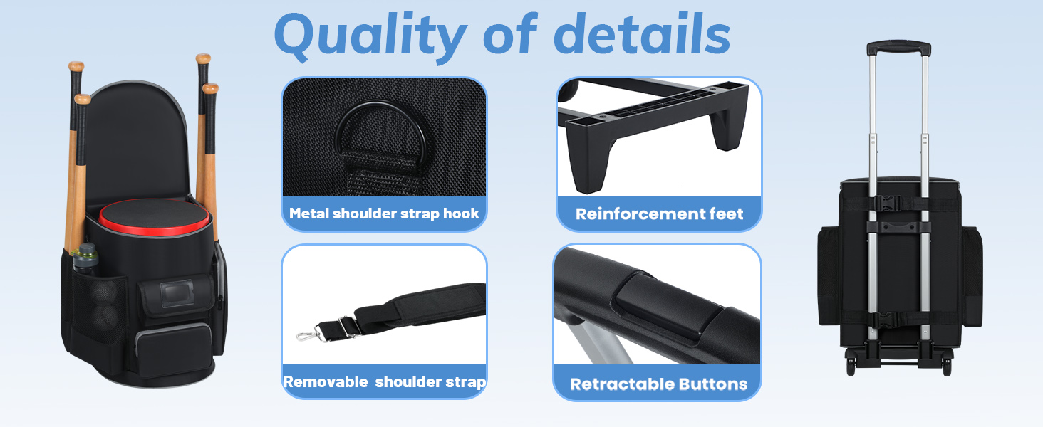 Multi-functional Baseball Bag:This product includes soft baseball bucket bag, shoulder strap, trolley. This softball bag with wheels makes carrying heavy baseball buckets and gear easy and comfortable. The detachable design of the rolling catchers bag allows the user to flexibly choose the way of use according to the actual needs