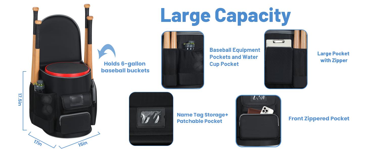 For 6-gallon Bucket: Baseball coaches bag large capacity, can easily hold a standard 6-gallon baseball bucket and bucket of baseballs. The top of the catchers bag with wheels features a round zipper design that makes it easy for users to put in and take out baseball buckets or other items