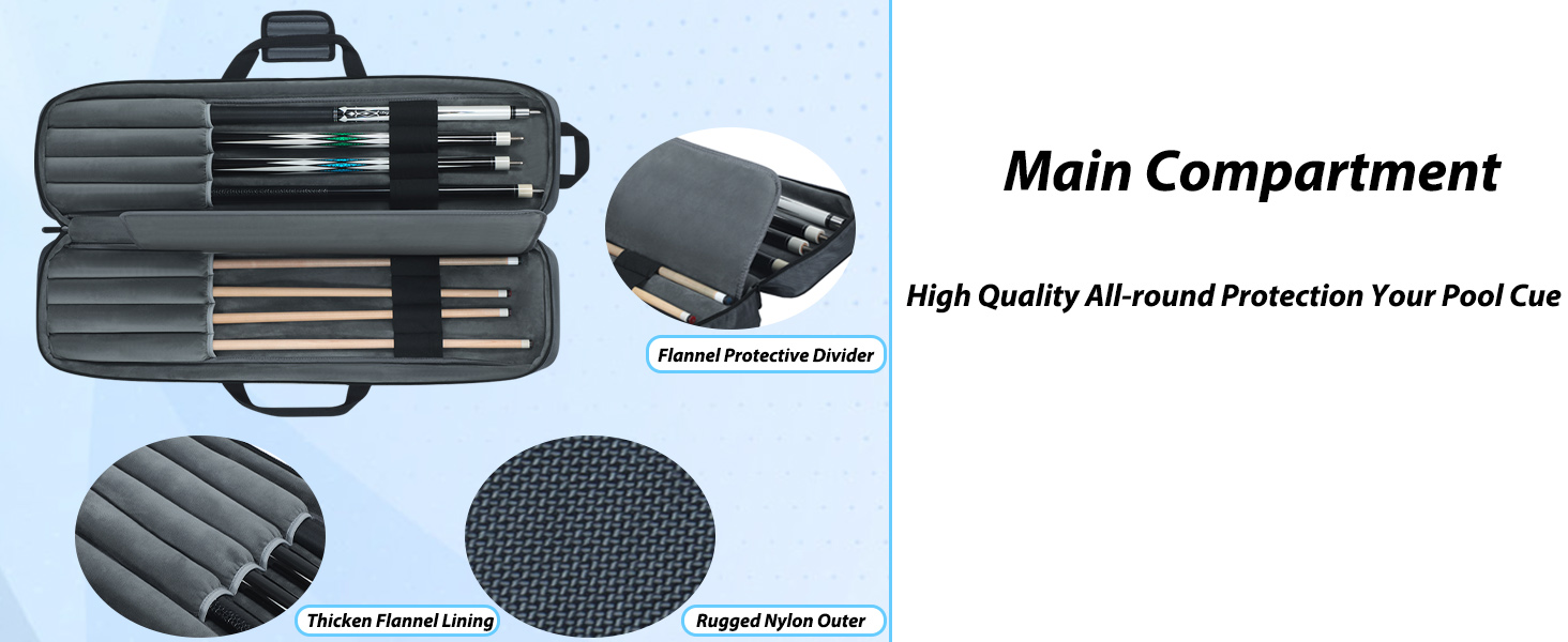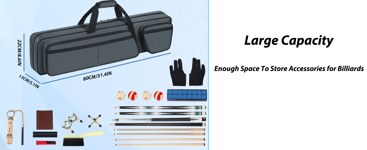 【Large Storage Space】: This padded soft pool cue bag measures 31.4 "L x 3.1 "W x 8.6 "H with a main compartment and 2 extra zippered pockets to adequately hold your billiard equipment. This pool stick case holds 4 cues (4x4 heads and shafts) in the main compartment, there is a padded divider that protects the cue components from banging together when the main compartment is closed