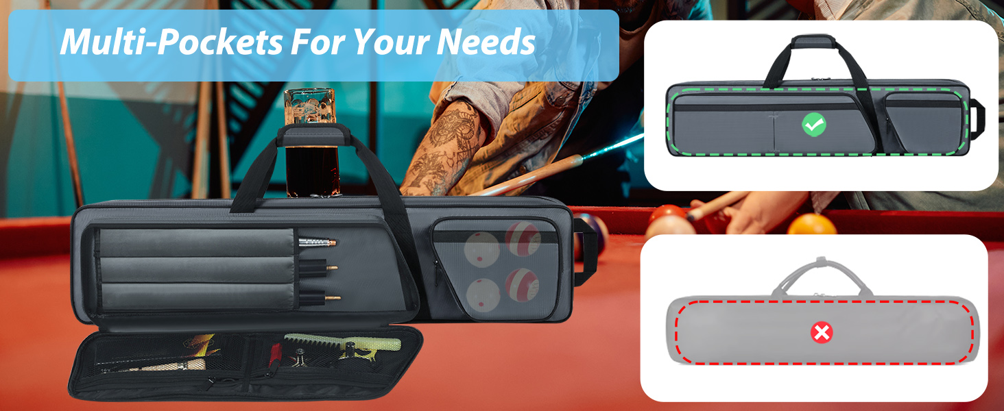 【Convenient To Carry And Store】: This pool cue case comes with adjustable padded shoulder pockets that can be hidden away when not needed. The padded carry handles can hold the weight well and also provide a comfortable grip. The top handle can be used to hang the pool queue case